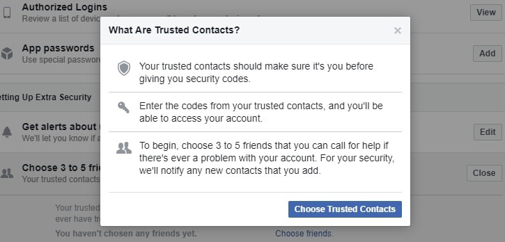 According to this feature, you to add trusted friends from your friends list as nominees, in case you got locked out of your Facebook account. These nominated friends can help you regain your Facebook account, in an unexpected event, like your Facebook account getting locked. Similarly, in case your Facebook account is hacked, and you are not able to log in to your account despite multiple attempts, your nominated friends can help you to log in to your account and update the security settings without much hassle. It is therefore an important feature in secure your Facebook account data.