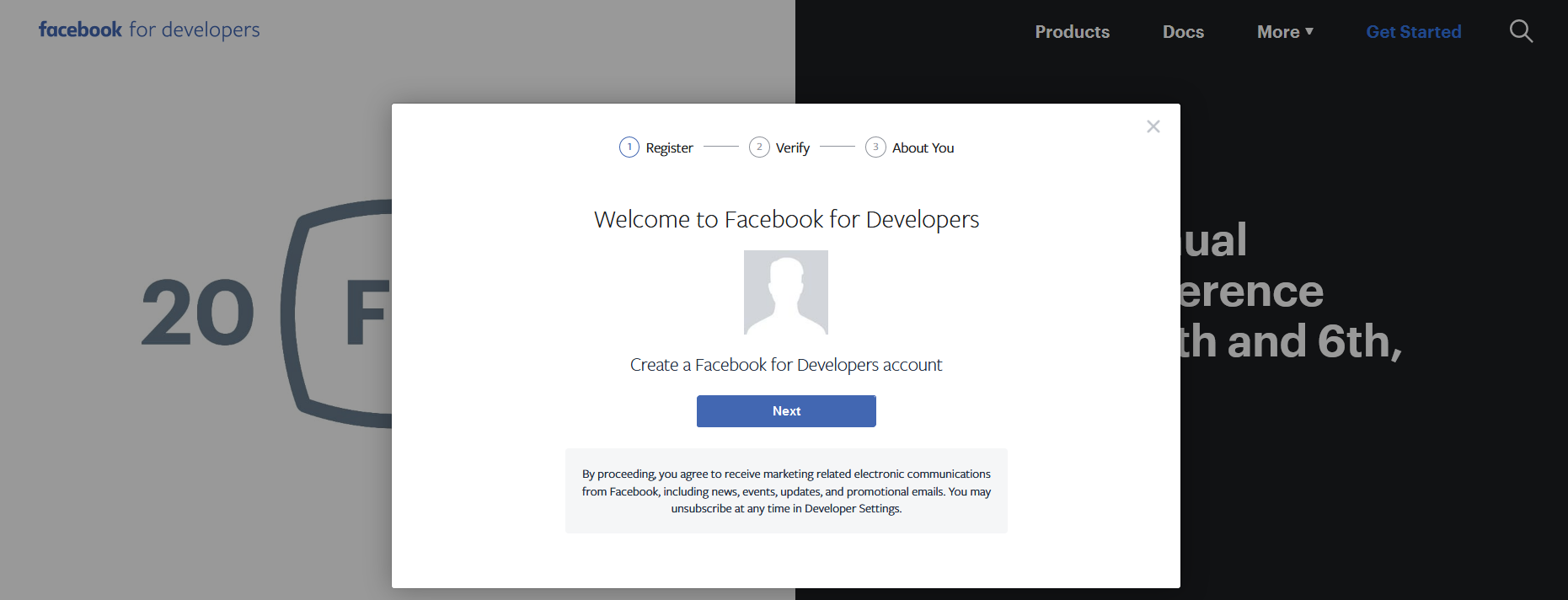 The first step to get Facebook Access Token is to create a Facebook Developer account. Facebook only allows individuals to register as Developers.